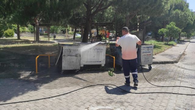 İlçe genelinde yer alan çöp konteynerleri belirli periyotlarla yıkanarak dezenfekte ediliyor.