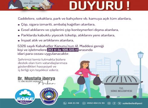 Söke Belediyesi, kamuya ait alanlarda çevre kirliliğine yol açanlara ve belirlenen temizlik kurallarına uymayanlara, Zabıta ekipleri tarafından 5326 sayılı Kabahatler Kanunu’nun 41. maddesi gereği idari para cezası uygulayacağını duyurdu.